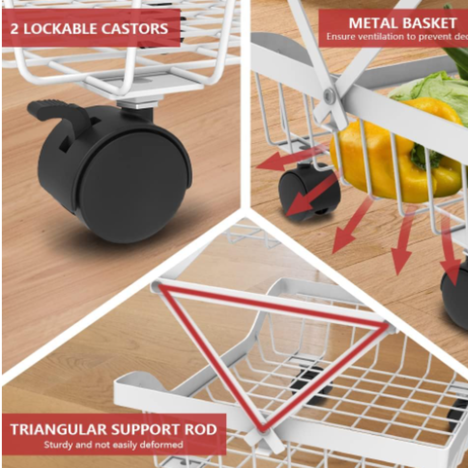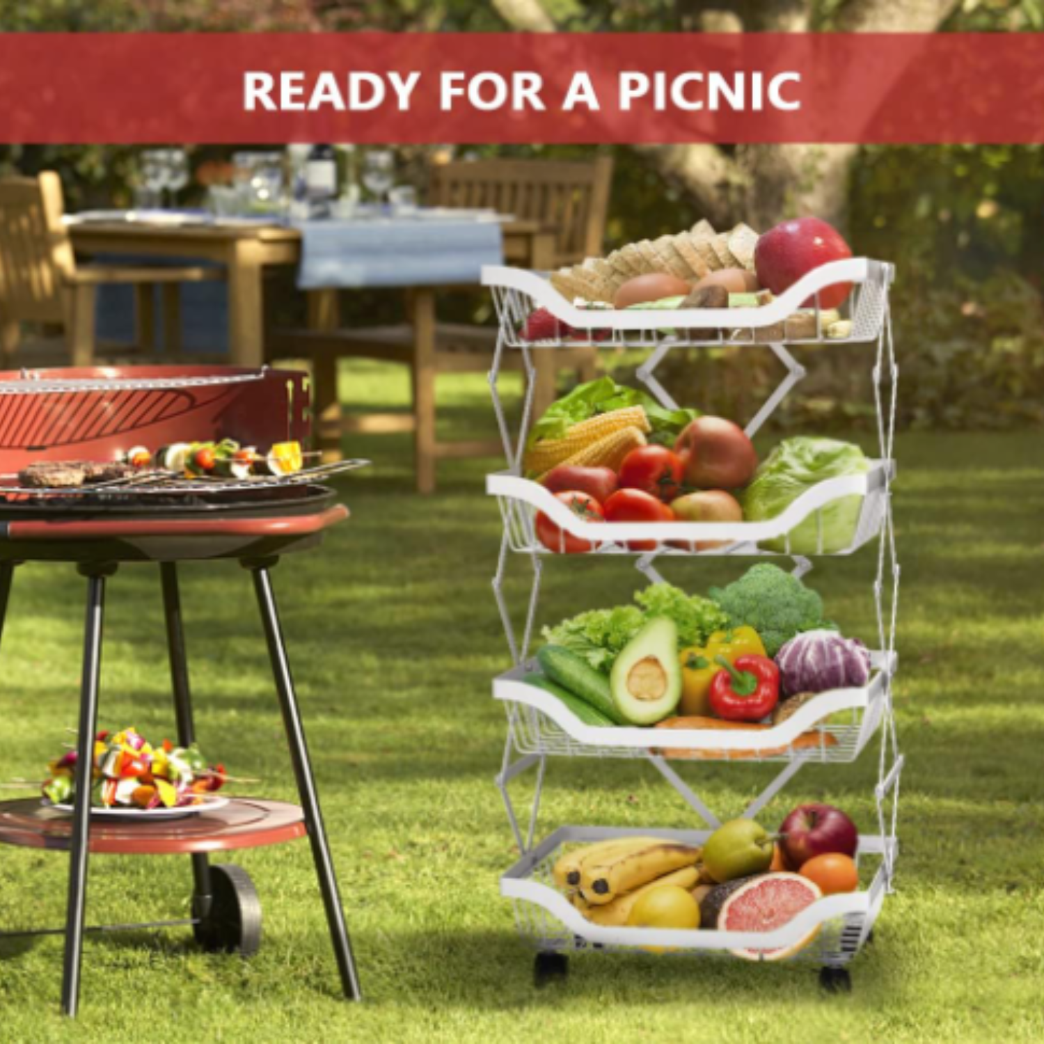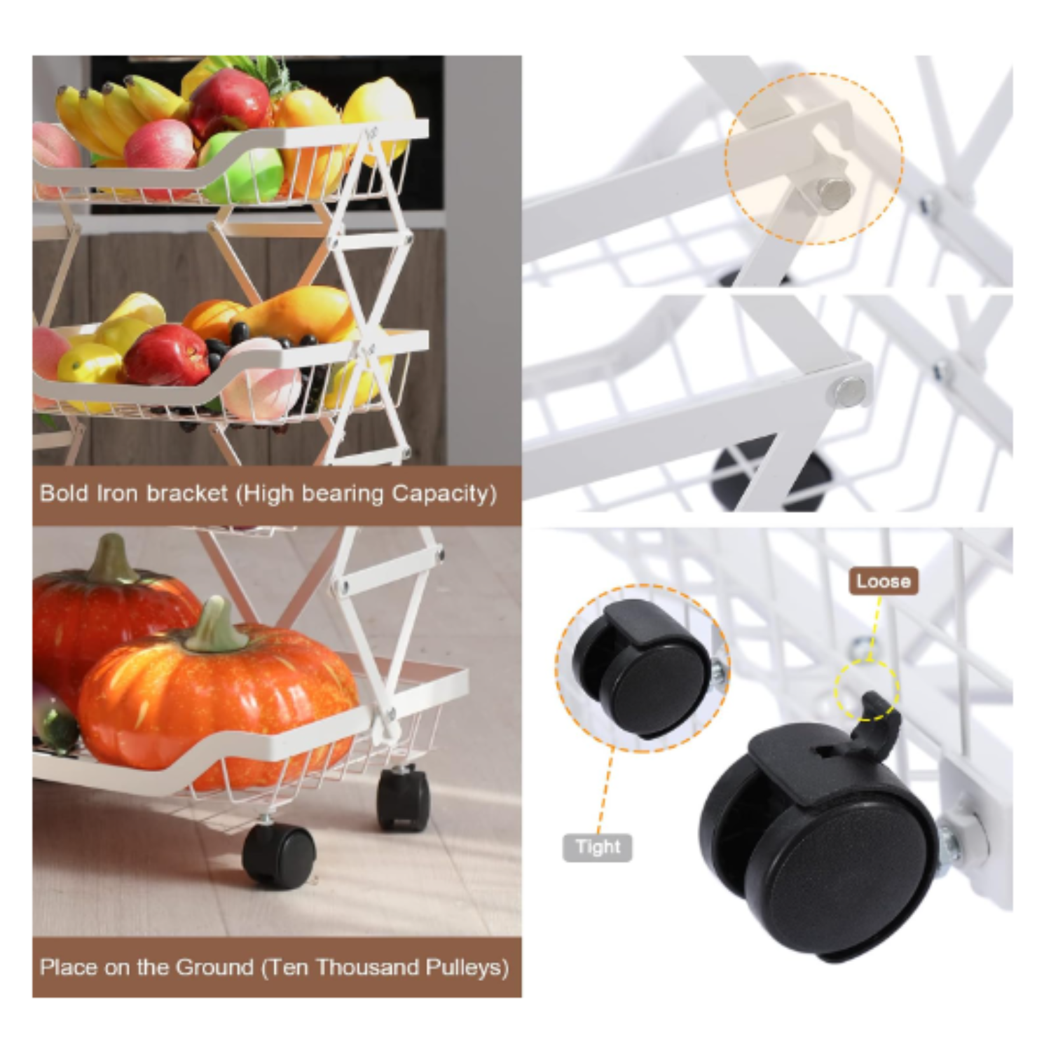 Ideal para almacenar verduras y frutas, este práctico carrito es perfecto para la cocina, el mercado o incluso para un picnic. Su diseño inteligente te permitirá mantener todo organizado y al alcance de tu mano.