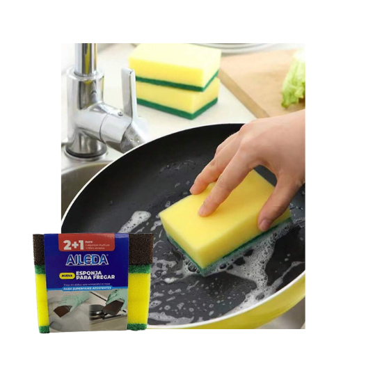 La esponja cuenta con una cara amarilla suave, ideal para lavar platos y utensilios delicados sin rayar, mientras que la cara verde abrasiva se encarga de eliminar la suciedad más resistente. Y para esas zonas donde hay mayor suciedad trae una esponja ideal para arranzar toda la grasa de tu cocina para superficies resistentes.