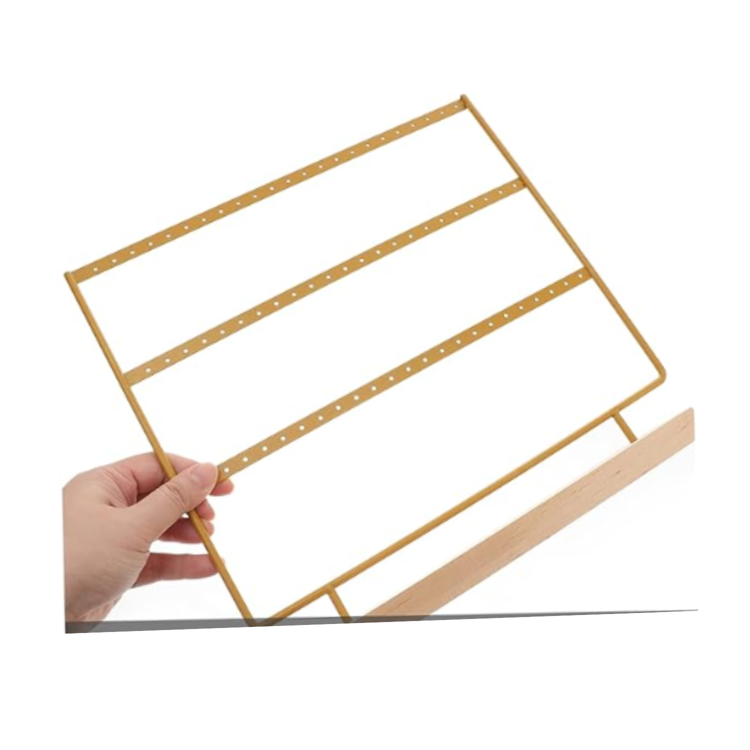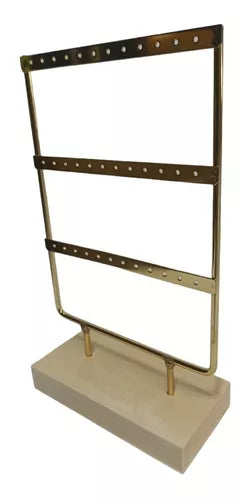 Presenta tus aros con estilo y organización con este Exhibidor de Aros Dorado. Su diseño elegante, con un marco de metal dorado y una base de madera resistente, lo hace perfecto tanto para tiendas como para uso personal en el hogar. Con capacidad para 36 pares de aros, este exhibidor es la solución ideal para mantener tus joyas a la vista y perfectamente organizadas.